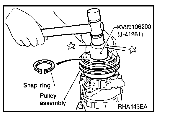 3. Install the pulley assembly using the installer and a hand press, and then install the snap ring using snap ring pliers.