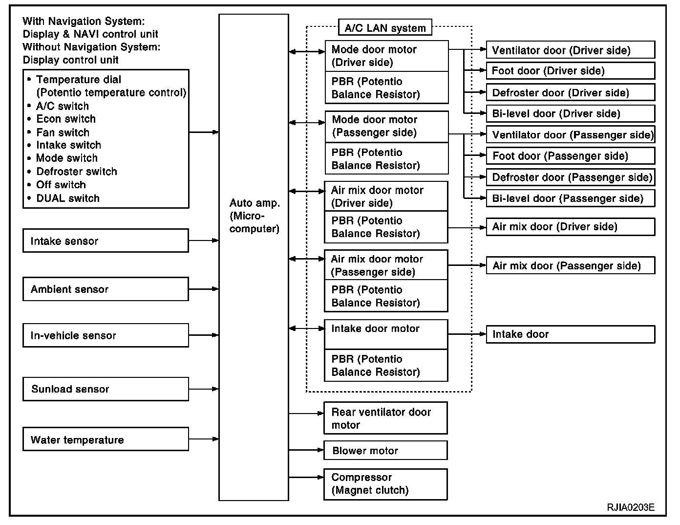 The compressor, intake doors, air mix doors, outlet doors and blower speed are automatically controlled so that the in-vehicle temperature will reach, and be maintained at the set temperature selected by the operator.
