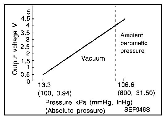 detects ambient barometric pressure and sends the voltage signal to the ECM. As the pressure increases, the voltage rises.