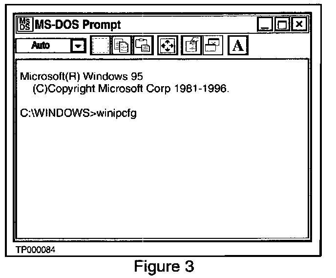 B. When the MS-DOS Prompt window appears, after C:\WINDOWS> type: winipcfg (see Figure 3).