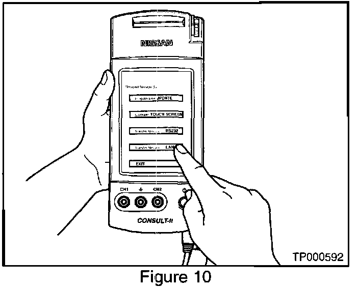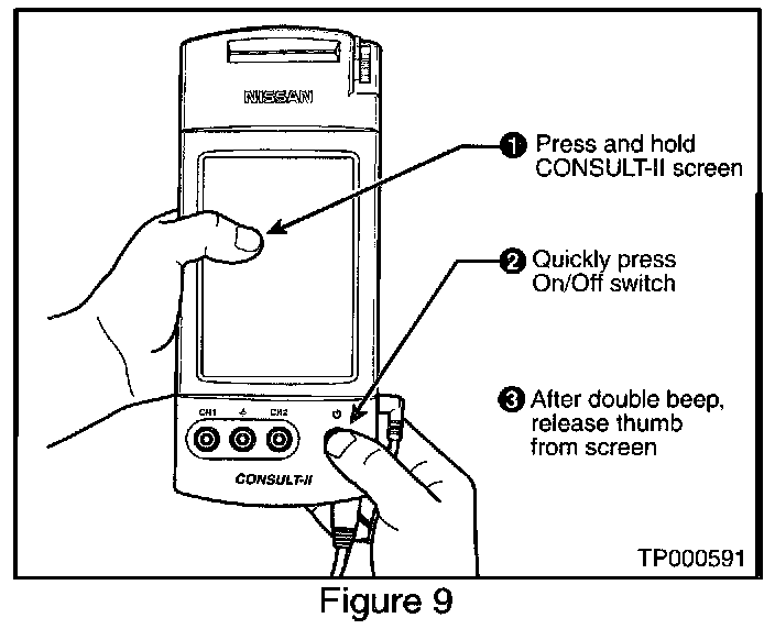 A. While pressing on the CONSULT-II screen with your thumb, quickly depress and release the ON/OFF switch (see Figure 9).