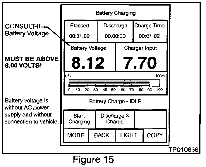 21. After about one minute has passed, check the CONSULT-II's battery voltage reading on the CONSULT-II screen (see Figure 15).