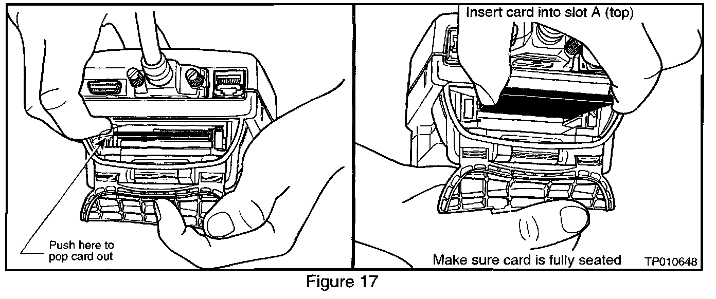 26. Remove the Diagnostics (red/white) card from slot A of CONSULT II and install the ECU Reprogramming card (orange) into slot A (see Figure 17).