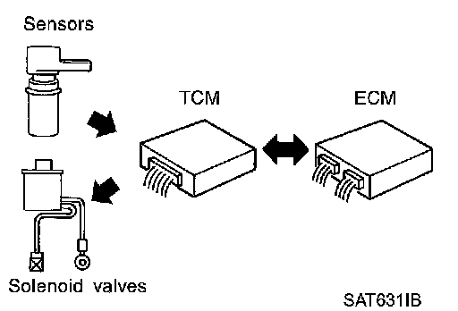 The TCM also communicates with the ECM by means of a signal sent from sensing elements used with the OBD-related parts of the A/T system for malfunction-diagnostic purposes. The TCM is capable of diagnosing malfunctioning parts while the ECM can store malfunctions in its memory.