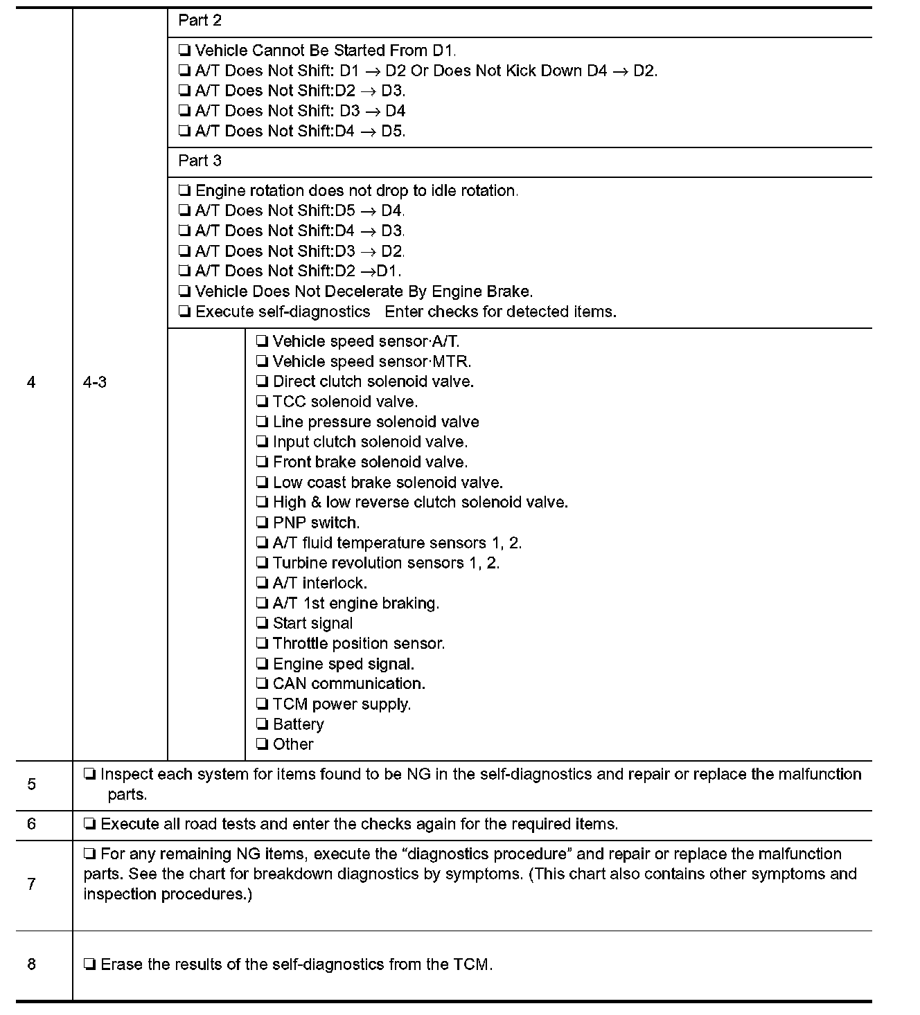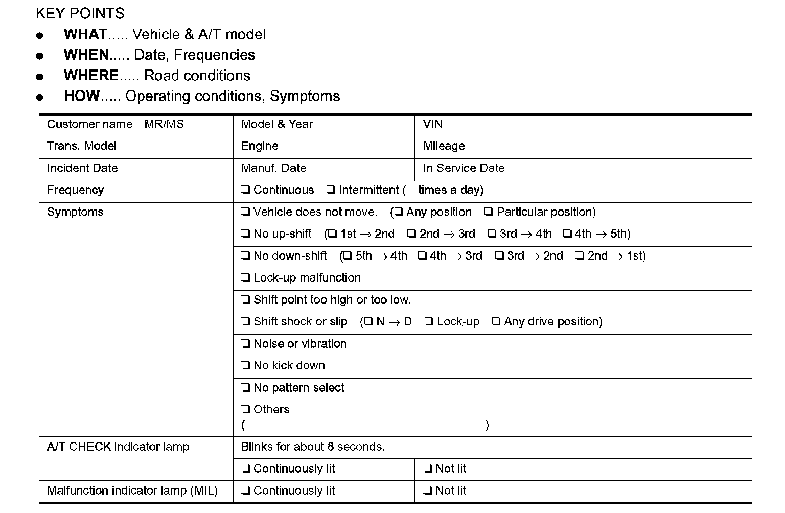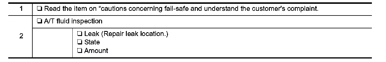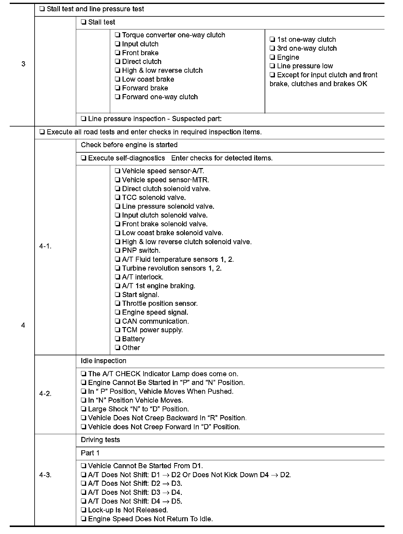 Input and output signals must always be correct and stable in the operation of the A/T system. The A/T system must be in good operating condition and be free of valve seizure, solenoid valve malfunction, etc.
