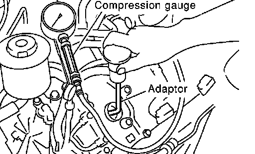 7. With accelerator pedal fully depressed, turn ignition switch to "START" for cranking. When the gauge pointer stabilizes, read the compression pressure and engine rpm. Perform these steps to check each cylinder.