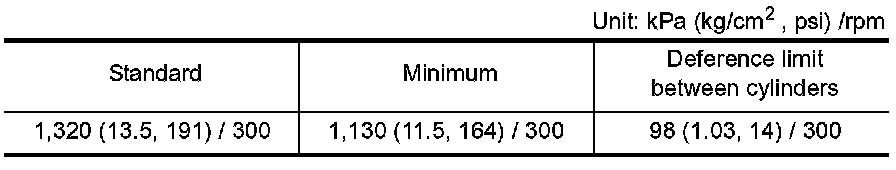 If compression pressure is below minimum value, check valve clearances and parts associated with combustion chamber (Valve, valve seat, piston, piston ring, cylinder bore, cylinder head, cylinder head gasket). After the checking, measure compression pressure again.