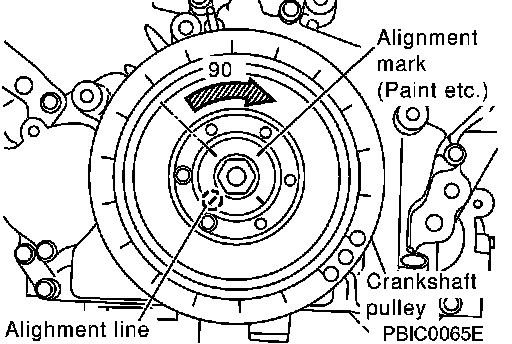 Select one most visible notch of the four on bolt flange. Corresponding to the selected notch, put a mating mark (such as paint) on crankshaft pulley.