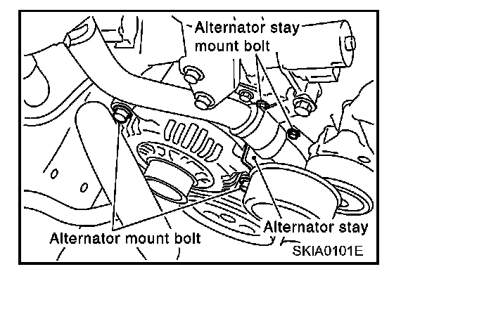 7. Remove alternator stay mounting bolts.
