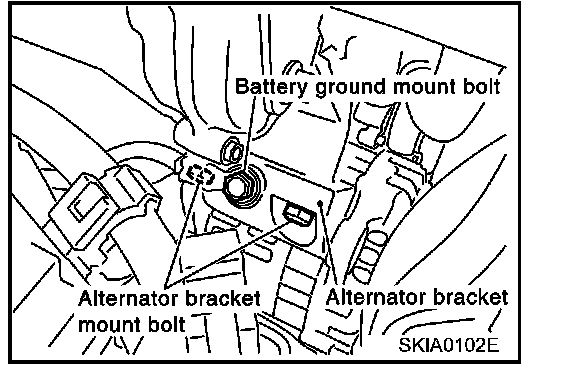 8. Remove battery ground cable mounting bolt and alternator bracket mounting bolts.