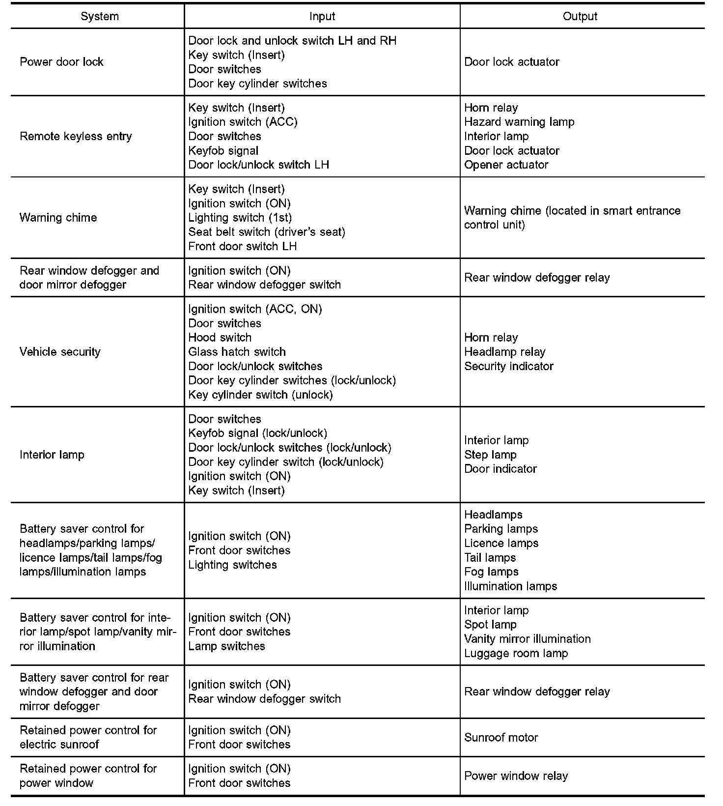 The smart entrance control unit totally controls the following body electrical system operations.
