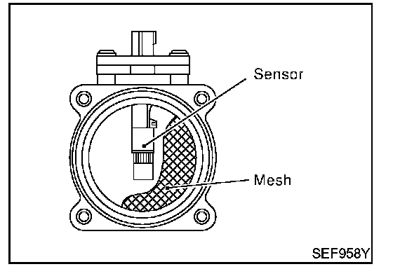 The mass air flow sensor is placed in the stream of intake air. It measures the intake flow rate by measuring a part of the entire intake flow. It consists of a hot film that is supplied with electric current from the ECM. The temperature of the hot film is controlled by the ECM a certain amount. The heat generated by the hot film is reduced as the intake air flows around it. The more air, the greater the heat loss.