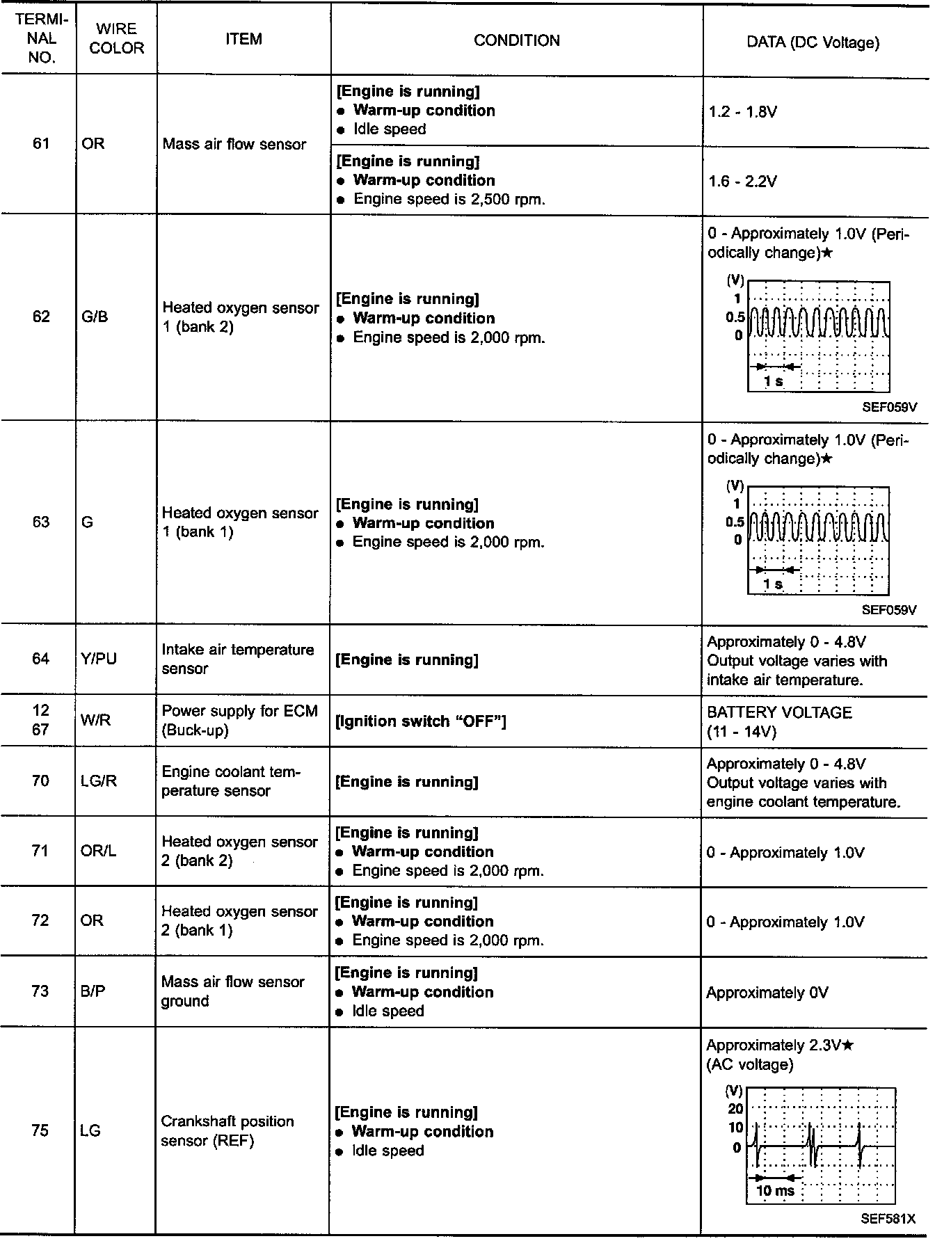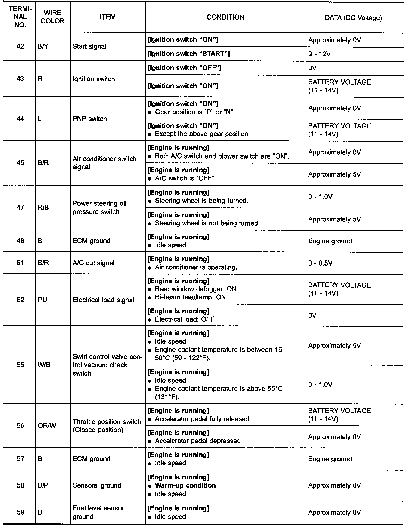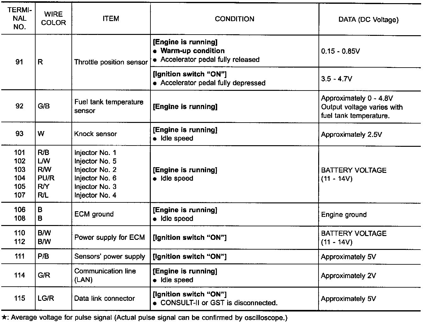 Do not use ECM ground terminals when measuring the input/output voltage. Doing so may result in damage to the ECM's transistor. Use ground other than the ECM terminals, such as the ground.
