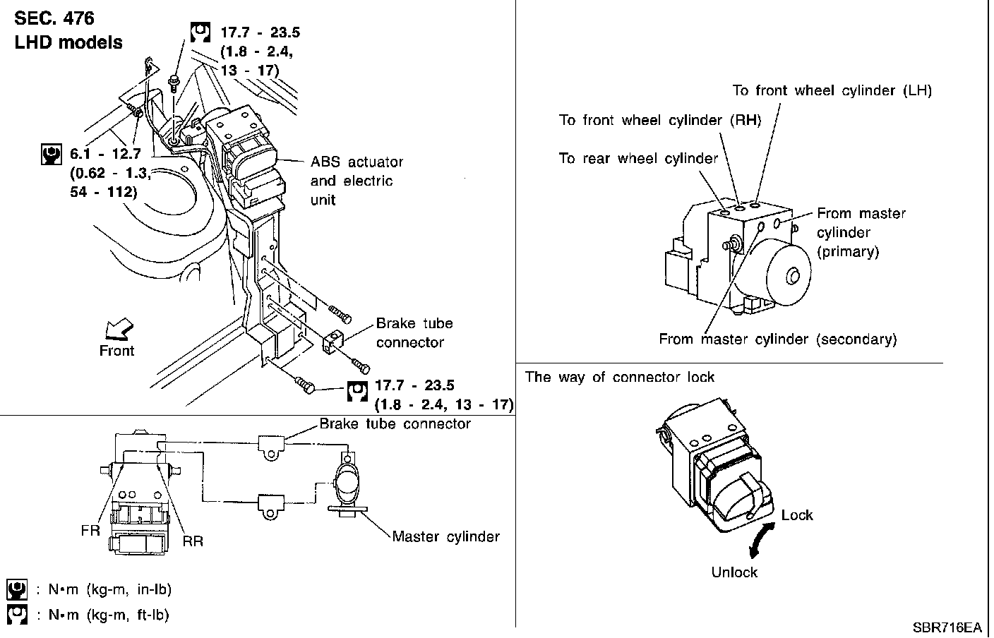 4. Disconnect connector, brake pipes and remove fixing nuts and actuator ground cable.
