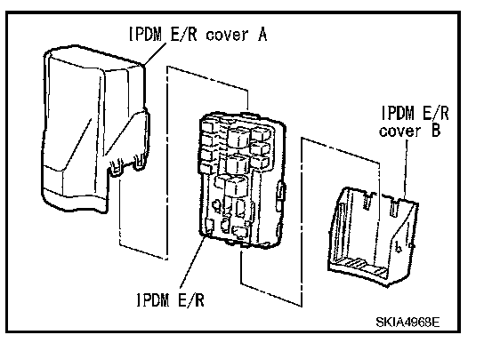 2. Remove IPDM E/R cover A. While pressing pawl on backside of IPDM E/R cover B toward vehicle front to unlock, lift up IPDM E/R.