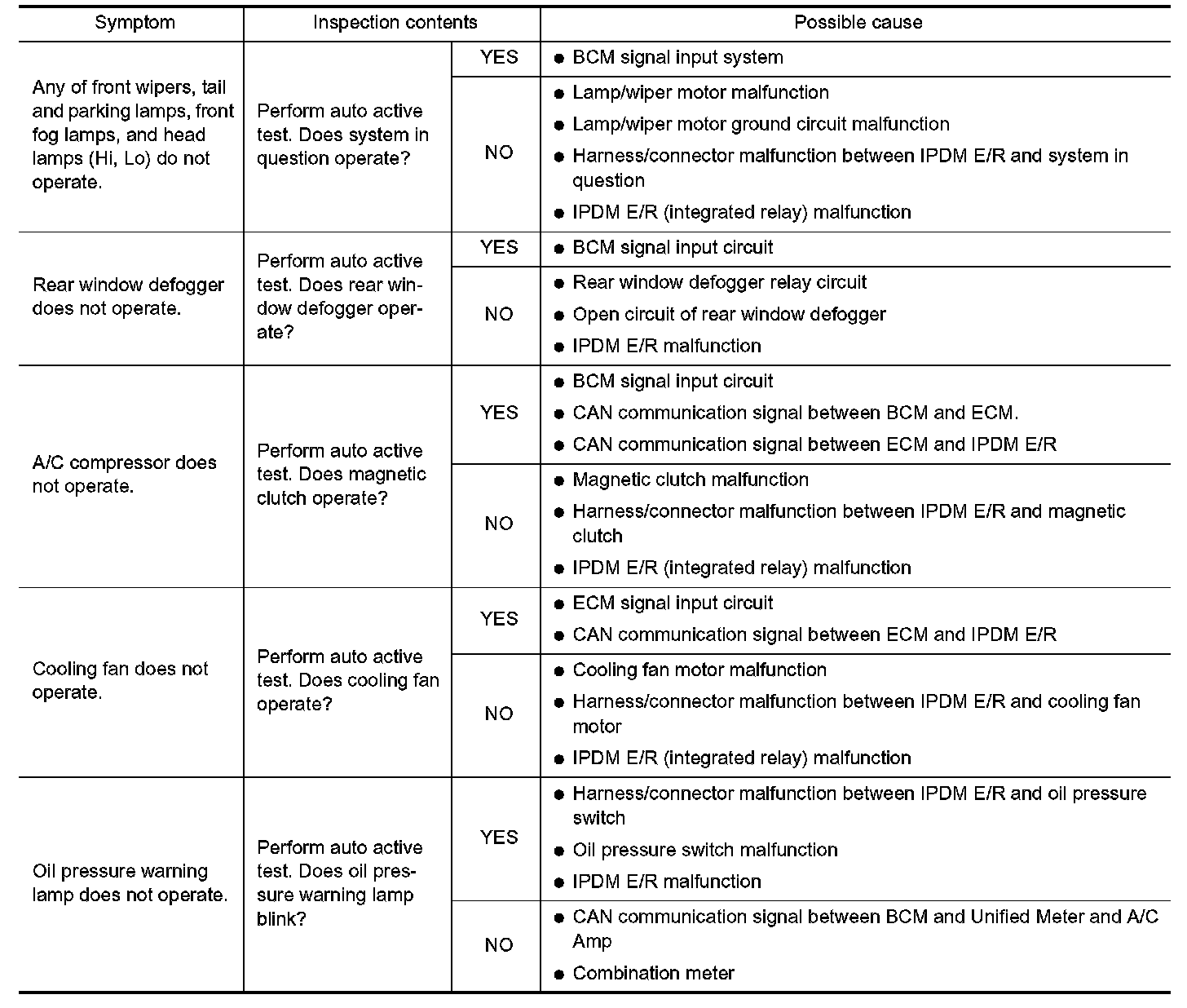 - If any of systems controlled by IPDM E/R cannot be operated possible cause can be easily diagnosed using auto active test.