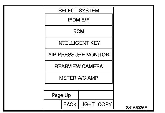 - If "IPDM E/R" is not displayed, print "SELECT SYSTEM" screen, then refer to "Precautions When Using CONSULT-II"