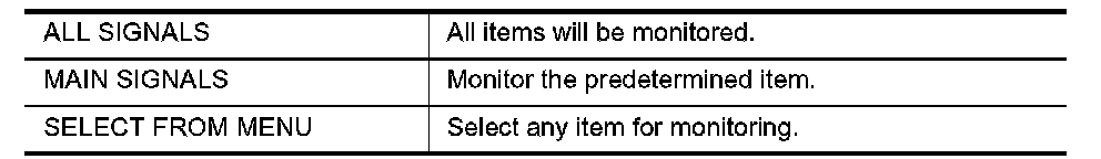 4. Touch the required monitoring item on "SELECT ITEM MENU". In "ALL SIGNALS", all items are monitored. In "MAIN SIGNALS", predetermined items are monitored.