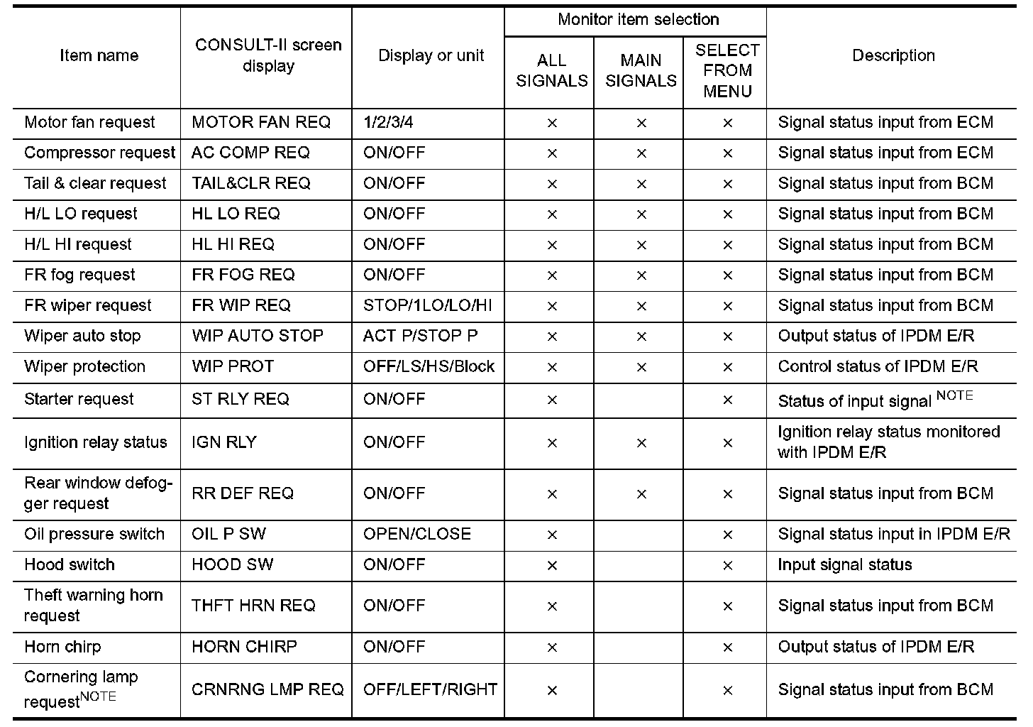 - Perform monitoring of IPDM E/R data with the ignition switch ON. When the ignition switch is at ACC, the display may not be correct.