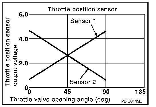 The throttle position sensor has the two sensors. These sensors are a kind of potentiometers which transform the throttle valve position into output voltage, and emit the voltage signal to the ECM. In addition, these sensors detect the opening and closing speed of the throttle valve and feed the voltage signals to the ECM. The ECM judges the current opening angle of the throttle valve from these signals and the ECM controls the throttle control motor to make the throttle valve opening angle properly in response to driving condition.