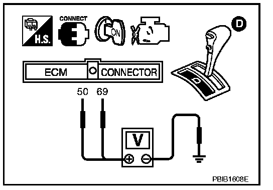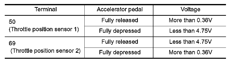 5. Check voltage between ECM terminals 50 (TP sensor 1signal), 69 (TP sensor 2signal) and engine ground under the specified conditions.