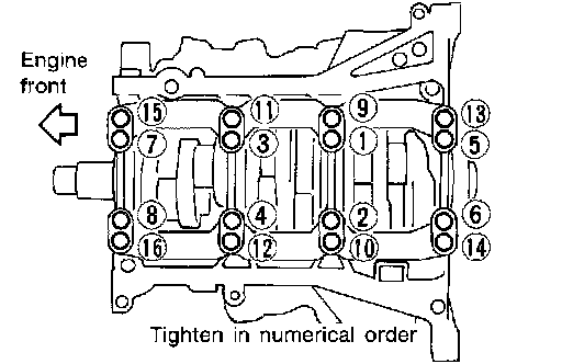 Step b; Tighten bolts in numerical order with tightening torque in several different steps 35.3 Nm (3.6 kg-m, 26 ft. lbs.)