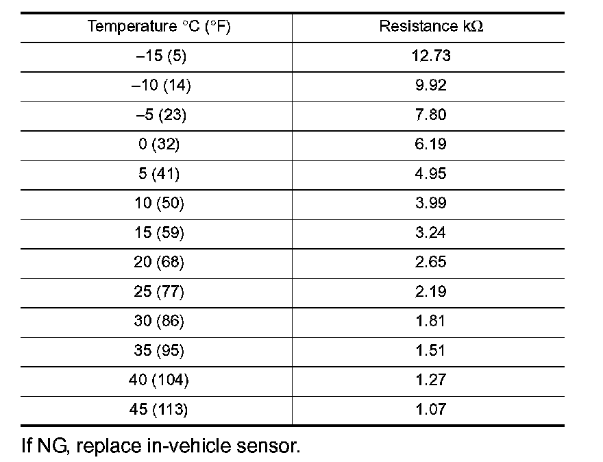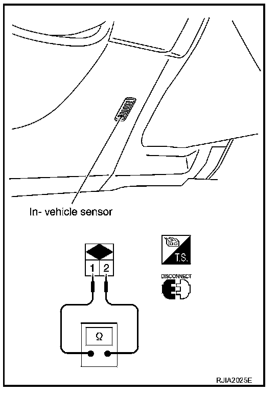 After disconnecting in-vehicle sensor connector measure resistance between terminals 1 and 2 at sensor harness side using the table.