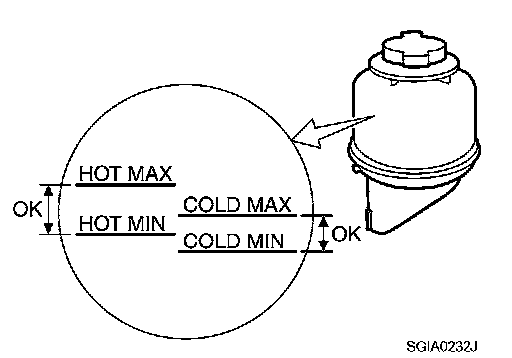 ^ Because fluid level differs within the HOT range and the COLD range, check it carefully.