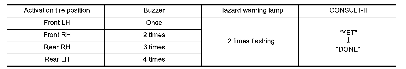 NOTE: Be sure to register the IDs in order from FR LH, FR RH, RR RH, to RR LH, or the self-diagnostic results display will not function properly.