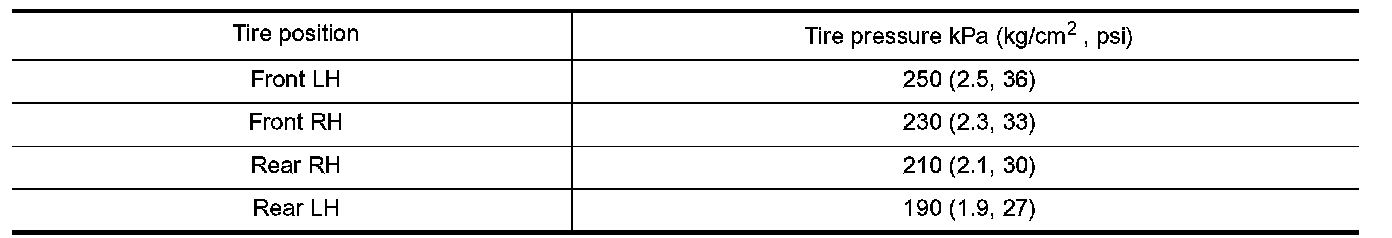 4. Adjust the tire pressure to the values shown in the table for ID registration, and drive the vehicle at 15 km/h (9.4 MPH) or more for a few minutes.
