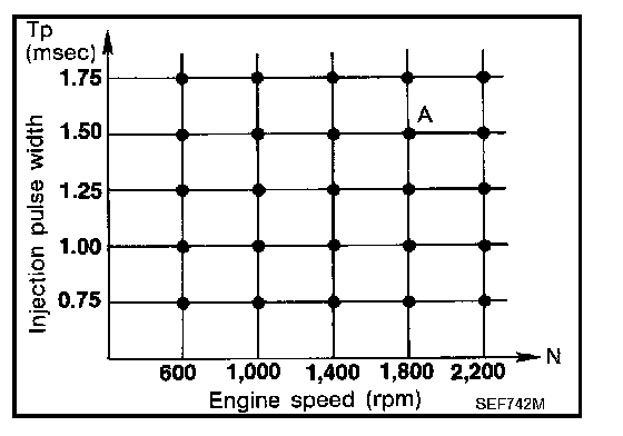 The ignition timing is controlled by the ECM to maintain the best airfuel ratio for every running condition of the engine. The ignition timing data is stored in the ECM. This data forms the map shown. The ECM receives information such as the injection pulse width and camshaft position sensor signal. Computing this information, ignition signals are transmitted to the power transistor.