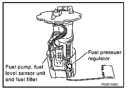 The fuel level sensor is mounted in the fuel level sensor unit. The sensor detects a fuel level in the fuel tank and transmits a signal to the unified meter and A/C amp. The unified meter and A/C amp. sends the fuel level sensor signal to the ECM through CAN communication line.