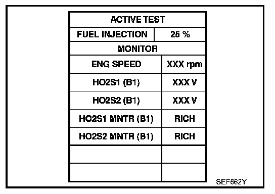 7. Check "HO2S2 (B1)/(B2)" at idle speed when adjusting "FUEL INJECTION" to ±25%.