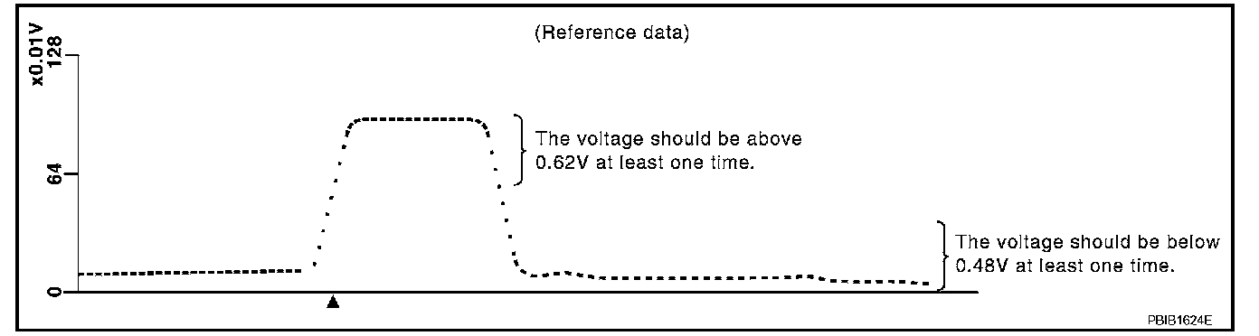 2. Set voltmeter probes between ECM terminal 16 [HO2S1 (B1) signal] or 35 [HO2S1 (B2) signal] and engine ground.