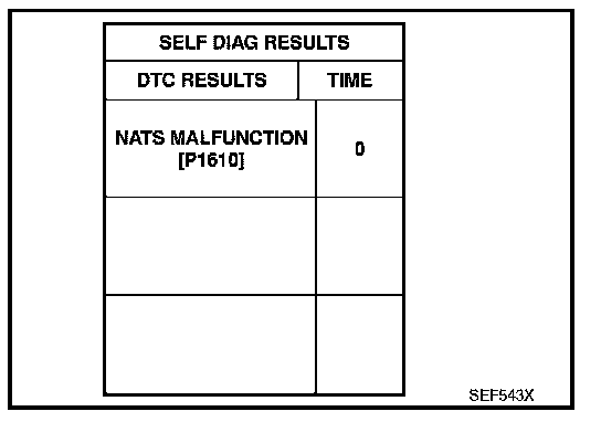 IVIS (Infiniti Vehicle Immobilizer System - NATS)- If the security indicator lights up with the ignition switch in the "ON" position or "NATS MALFUNCTION" is displayed on "SELF-DIAG RESULTS" screen, perform self-diagnostic results mode with CONSULT-II using NATS program card.