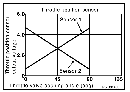 The throttle position sensor has the two sensors. These sensors are a kind of potentiometers which transform the throttle valve position into output voltage, and emit the voltage signal to the ECM. In addition, these sensors detect the opening and closing speed of the throttle valve and feed the voltage signals to the ECM. The ECM judges the current opening angle of the throttle valve from these signals and the ECM controls the throttle control motor to make the throttle valve opening angle properly in response to driving condition.