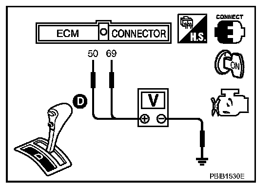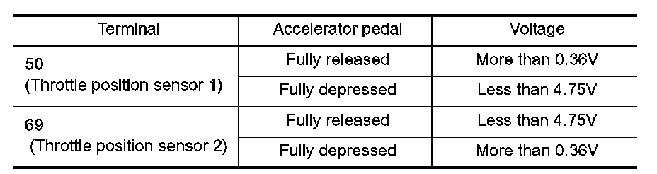 5. Check voltage between ECM terminals 50 (TP sensor 1signal), 69 (TP sensor 2signal) and engine ground under the specified conditions.