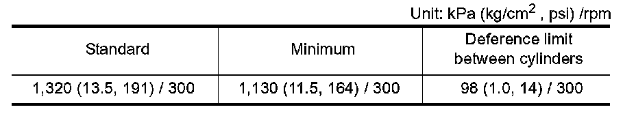 ^ If compression pressure is below minimum value, check valve clearances and parts associated with combustion chamber (Valve, valve seat, piston, piston ring, cylinder bore, cylinder head, cylinder head gasket). After the checking, measure compression pressure again.