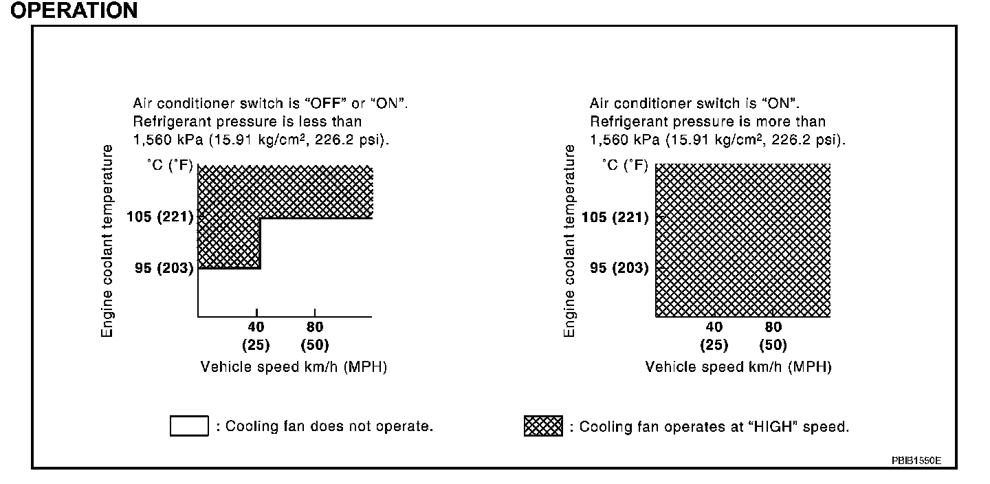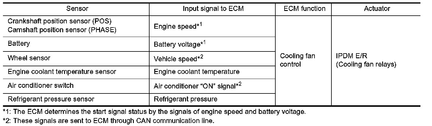 The ECM controls the cooling fan corresponding to the vehicle speed, engine coolant temperature, refrigerant pressure, and air conditioner ON signal. The control system has 2-step control [HIGH/OFF].