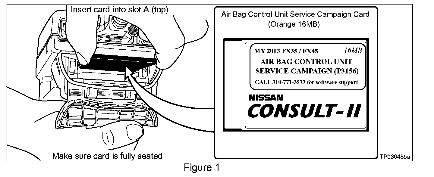 1. Install the special reprogramming card Air Bag Control Unit Service Campaign (P3156) [Orange 16MB] into slot A of CONSULT-II (see Figure 1).