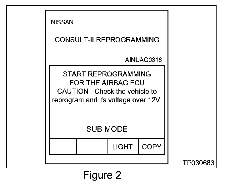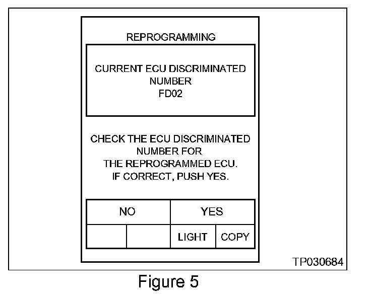 ^ If the "CURRENT ECU DISCRIMINATED NUMBER" is "FD02" or "FD03" the Air Bag Control Unit needs to be reprogrammed. Press "YES" on the Reprogramming screen (see Figure 5) to continue with the reprogramming (see step 10).