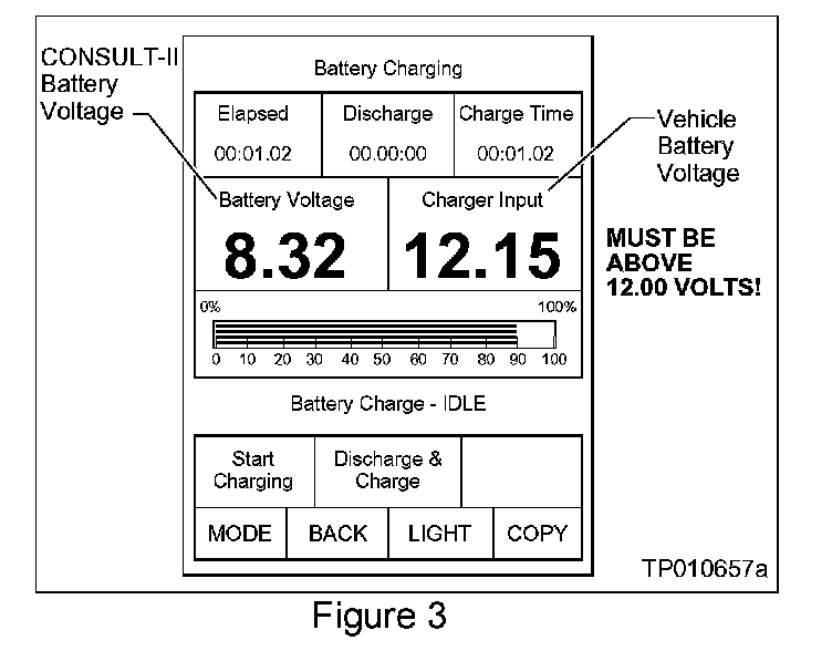 6. Check the vehicle's battery voltage reading on the CONSULT-II screen (see Figure 3).