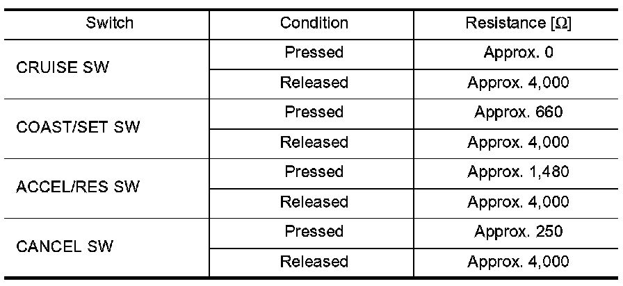 Check continuity between ASCD steering switch terminals 1 and 2 with pushing each switch.