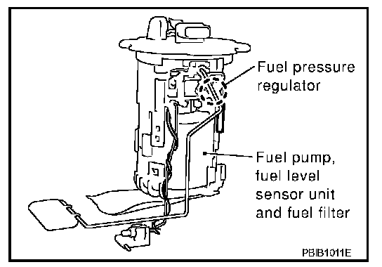 The fuel level sensor is mounted in the fuel level sensor unit. The sensor detects a fuel level in the fuel tank and transmits a signal to the ECM.