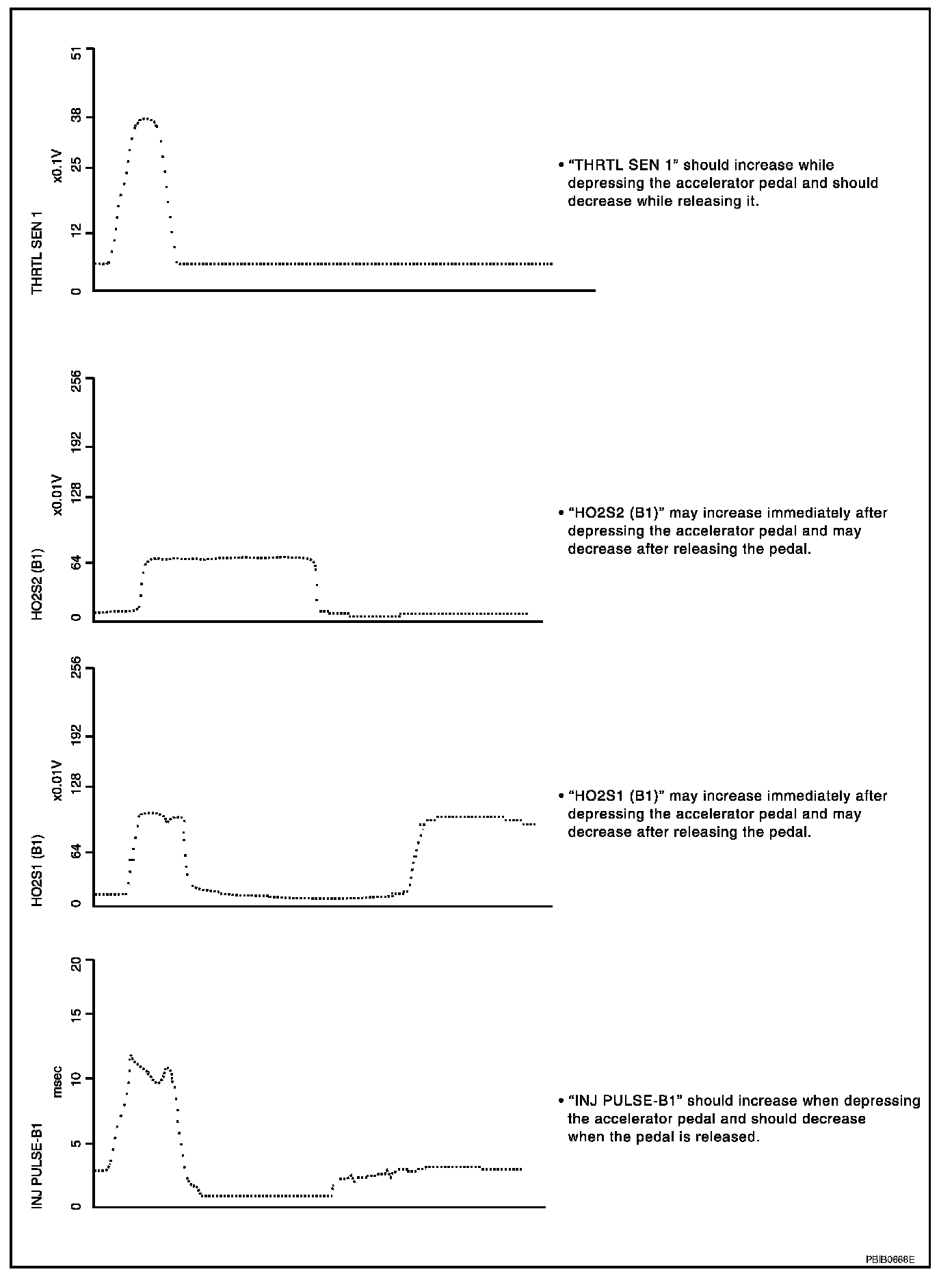 Above is the data for "ENG SPEED", "MAS A/F SE-B1", "THRTL SEN 1", "HO2S2 (B1)", "HO2S1 (B1)" and "INJ PULSE-B1" when revving engine quickly up to 4,800 rpm under no load after warming up engine sufficiently.