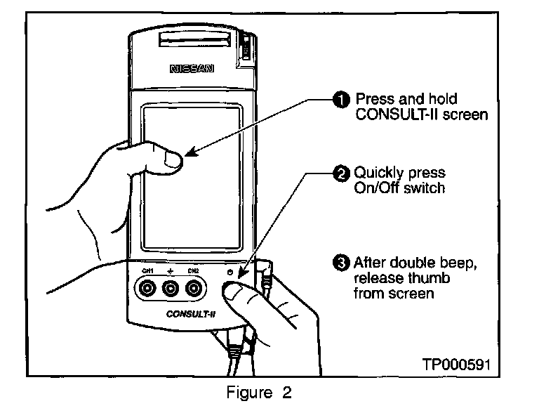 A. While pressing on the CONSULT-II screen with your thumb, quickly depress and release the ON/OFF switch (see Figure 2).