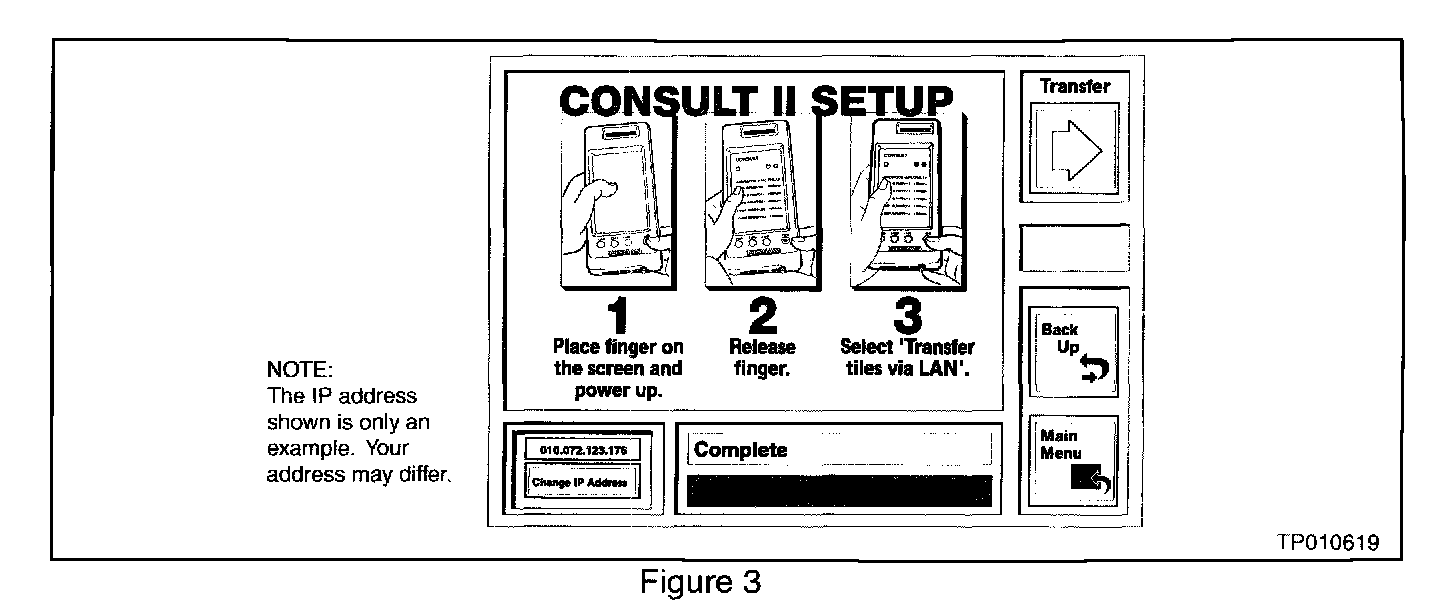 DO NOT DISCONNECT THE ETHERNET CABLE UNTIL "COMPLETE" IS DISPLAYED AS SHOWN IN FIGURE 3. If the cable is disconnected before "Complete" is displayed you MUST restart the download procedure. Otherwise TCM damage can occur.