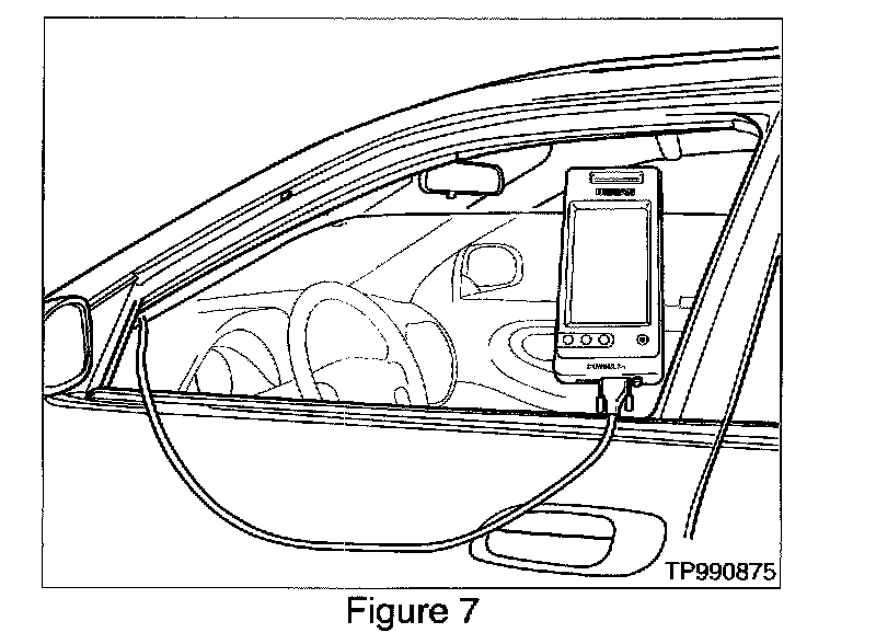 35. Roll down the driver's window part way, exit the vehicle, close the door and hang the CONSULT-II unit on the outside of the window (see Figure 7).
