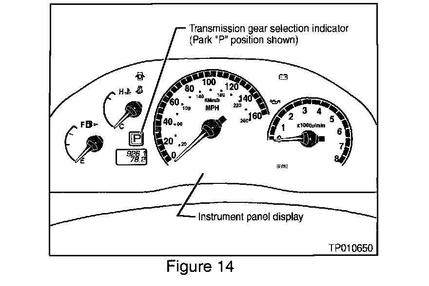 61. Depress the brake pedal and move the shift lever from "P" to "R" to "N" to "D", making sure the indicator next to the speedometer (see Figure 14) correctly displays each selected shift lever position.