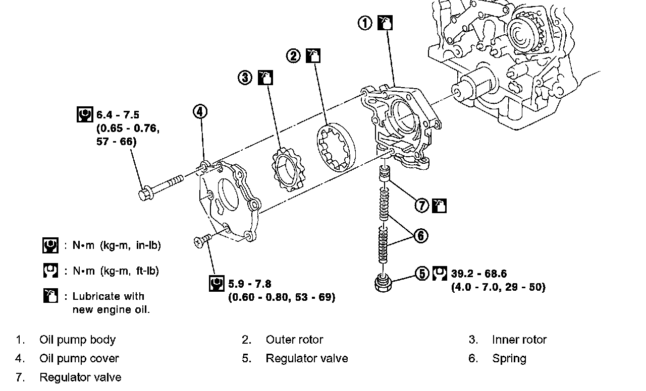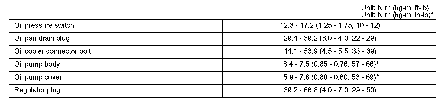 Oil pump body 6.4 - 7.5 Nm (0.65 - 0.76 kgf-cm, 57 - 66 inch lbs.)